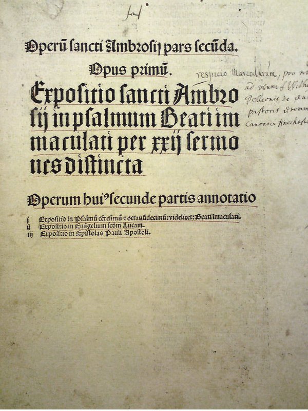 Die oben stehende Bildergalerie dokumentiert die Evolution vom ursprünglichen Schmutzblatt mit Titel zum vollwertigen und ausgeschmückten Titelblatt. Das erste Bild zeigt die typische Titelangabe bei einem Abrosius von 1492 (Basel, Amerbach) gefolgt von einem Druck von 1503 (Köln, Retro Minores) bis hin zu einem voll entwickelten Titelblatt eines Druckes von 1515 (Hagenau, Gran).